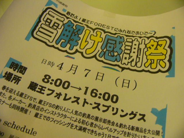 いよいよ4月7日(日)は 雪解け感謝祭を開催致します! 今年も各メーカーさんが展示会&即売会 そして各メーカさんによる個別指導セミナー プチ釣り大会 じゃんけん大会と 釣りをしながらイベントも楽しめちゃいますよー! 是非ご来場して下さいねー!当日は 臨時駐車場をご用意しておりますが 出来る方は 乗り合いでの来場をお願い致します