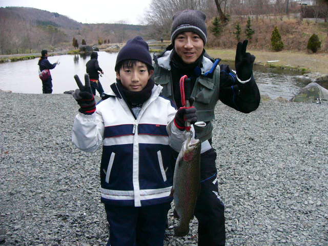 写真の親子さんも 流れ込み周辺にバズボールを落とした瞬間 良いサイズのレインボーが飛付いて来てましたー!