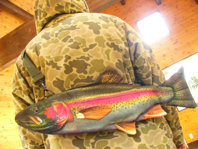 最近 蔵王FSに来場されるお客様の服装が様々になって来たなーと感じ始めた今日この頃です そのまま渓流に行けちゃう装備の方から町場で見かけるカジュアルの方まで本当に色々ですねー! 中には 鱒型バックを肩に掛け釣りを楽しむ常連さんも とある釣具屋さんで購入したらしいですよ 見た感じスチールヘッドかな? 釣り場ならではの 洒落たバックですねー!