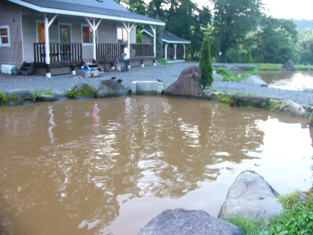 昼過ぎ位に 黒い雲と激しい雨! 30分位でしょうか思ったよりは 降りませんでしたが 山の上はかなり降ったらしく 2号〜6号あっと言う間に濁ってしまいました こうなるとトップ系では反応しなくなるので 重めのスプーンが 良くなりますね